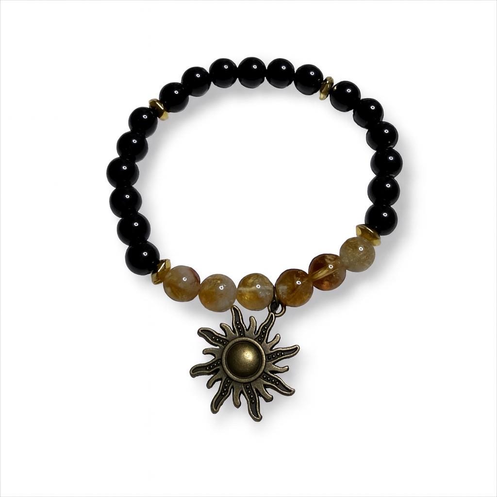 Illuminate your spirit with this handcrafted Citrine & Black Onyx Sun Bracelet, designed to channel warmth, clarity, and grounded strength. Each bracelet is made with intentionally selected gemstones and finished with a detailed antique-bronze sun charm, creating a piece that feels both magical and meaningful.