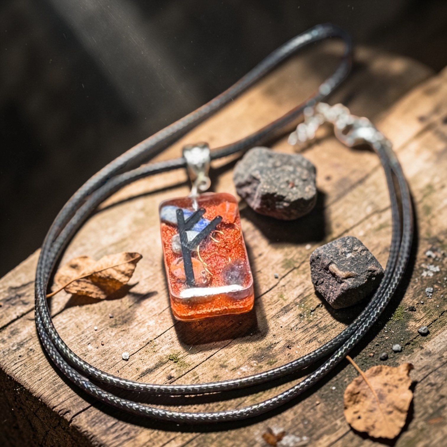 This unique pendant features the ancient Fehu rune, a powerful Norse symbol associated with wealth, success, and new beginnings. Encased in resin with layered elements, each piece carries a one-of-a-kind look and energy.