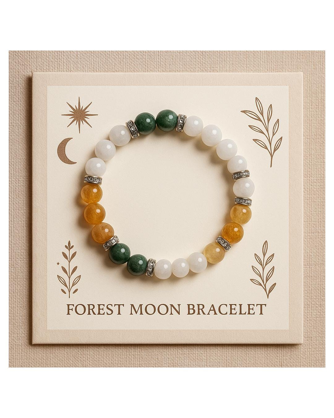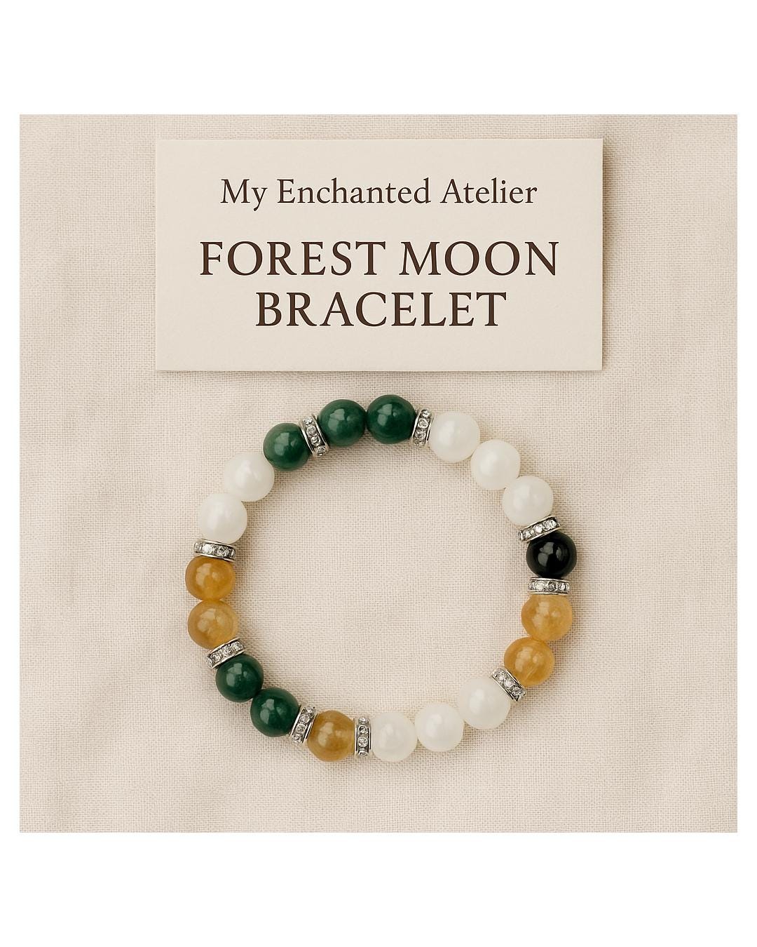 Handcrafted with intention, this enchanted gemstone bracelet brings together the grounding energy of the forest with the soft magic of moonlight. Each stone is chosen for its meaning, energy, and natural beauty — creating a wearable charm of harmony, protection, and abundance.